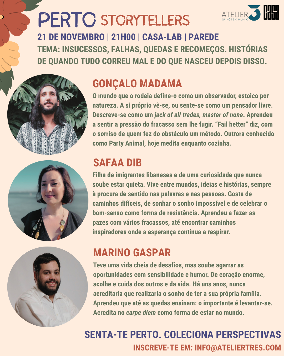 Em cada sessão, vozes diferentes partilham experiências profundas em torno de uma temática — insucessos, viagens, identidade, pertença — criando um espaço sensível onde o quotidiano ganha corpo e significado.