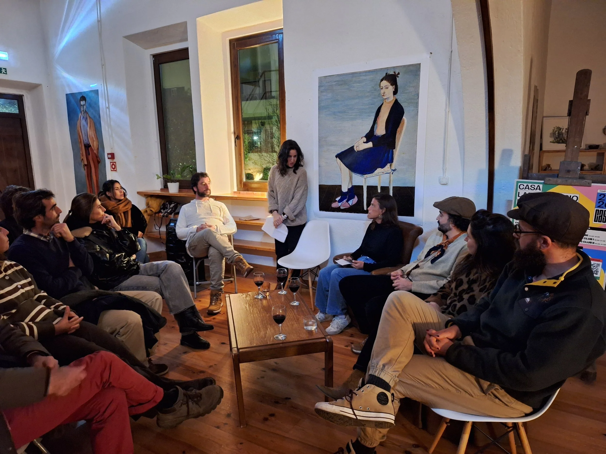 O projeto acontece ao final do dia, num ambiente acolhedor — a nossa CASA — onde se serve chá ou vinho, a luz é baixa e as palavras circulam devagar.